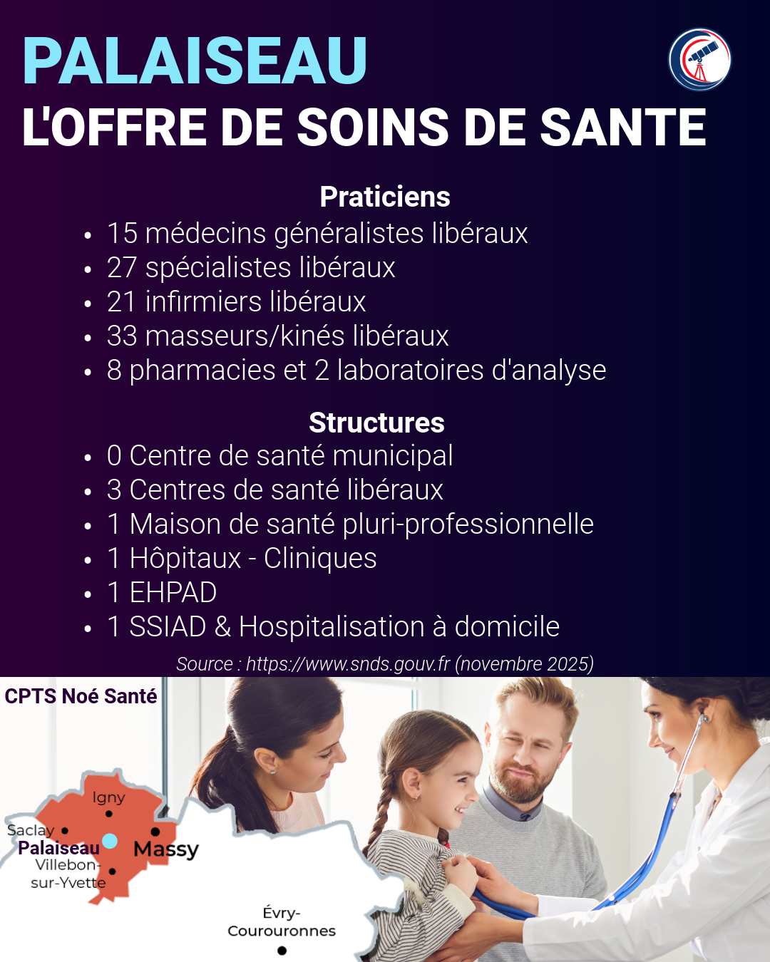 Cette analyse vise à évaluer l’efficacité réelle des politiques locales de santé mises en œuvre par la commune de Palaiseau, en particulier le recours à un médicobus et la création d’une Maison de Santé Pluriprofessionnelle. L’évaluation repose exclusivement sur des données publiques, comparables et vérifiables issues d’organismes institutionnels.