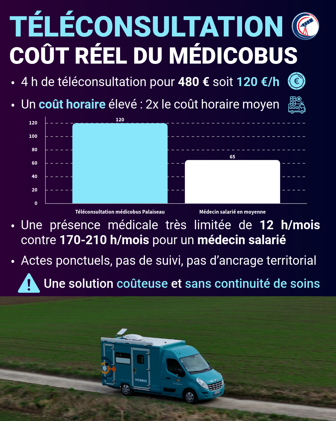 Le médicobus mis en place à Palaiseau présente un coût horaire de 120 €/h pour une présence médicale limitée à 12 heures par mois. À titre de comparaison, un médecin salarié assure en moyenne 170 à 210 heures mensuelles pour un coût horaire inférieur. Aucun bilan public d’efficacité n’a été publié après deux années d’expérimentation.