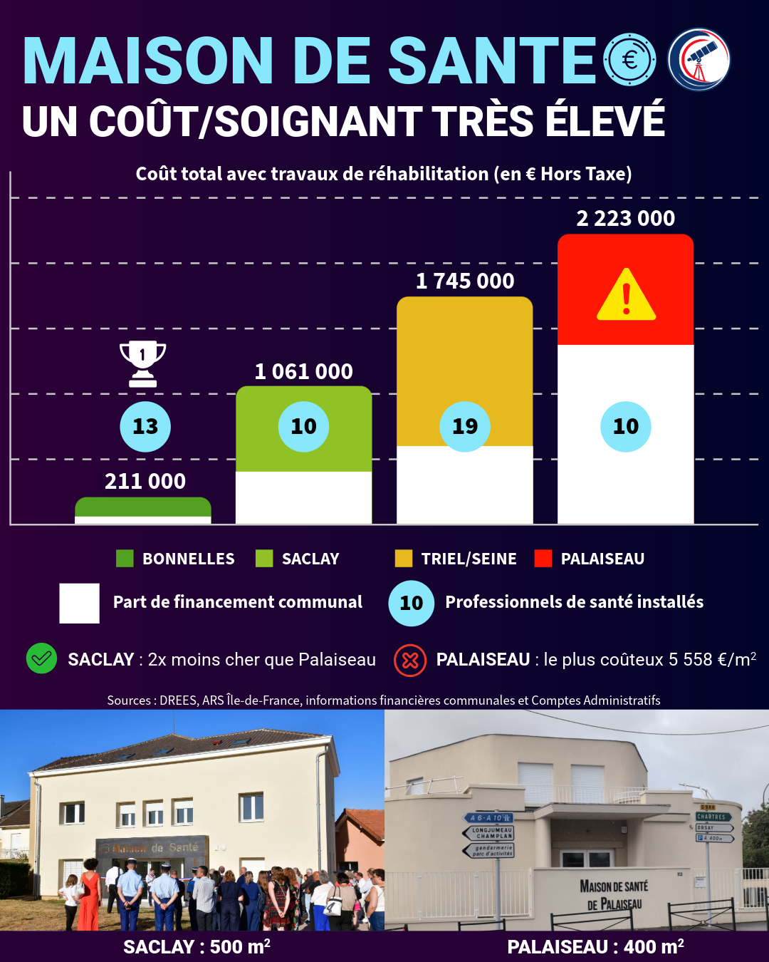 Comparée aux projets les moins coûteux, Palaiseau apparaît comme une anomalie budgétaire : pour un coût très supérieur, la commune obtient moins de surface, moins de professionnels et peu de nouveaux médecins. Là où d’autres communes font « plus avec moins », Palaiseau fait moins avec plus, ce qui interroge directement l’efficacité de l’utilisation des deniers publics.